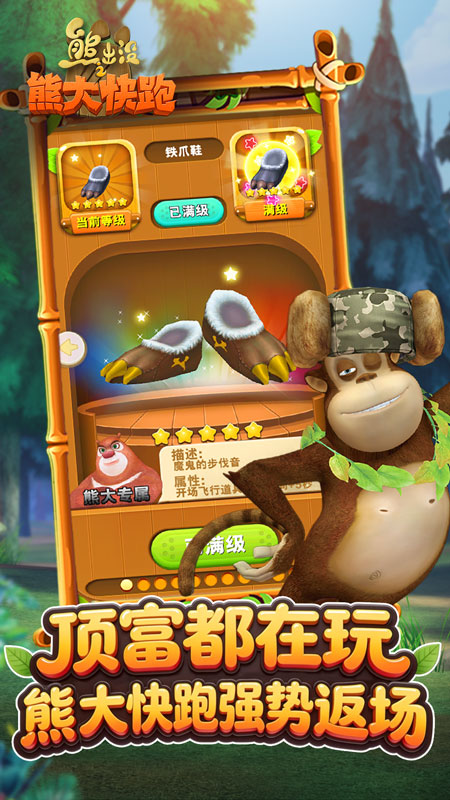 春天降臨,萬物復蘇。熊大熊二,引領冒險跑酷潮流,新的一年讓熊出沒與你一起度過! 【春暖花開 熱力冒險】 游戲的整體風格重新回到了充滿綠意的草地森林,讓你感受春天的生機盎然。更多特效更新和細節優化,還等玩家自己來游戲中親自發現哦~角色細節更加精致,為你帶來全新視覺盛宴!關卡設計全面優化,游戲節奏感更強,熊大、熊二的跑酷之旅更加精彩! 【超強萌寵 百變造型】 驚險刺激的冒險怎能少了寵物的陪伴,風翼白虎、福運青龍、機械熊貓、飛天小哈…每個寵物都有自己特殊的技能,讓你在冒險中如虎添翼,達成解鎖條件即可免費擁有,趕緊把這些可愛迷人的小寶貝領回家吧。游戲中還可以給熊大熊二隨意換裝哦,頭戴骷髏帽的船長熊大,手拿金箍棒的美熊王,翱翔太空的宇航熊,總有一款是你的菜。 【多樣玩法 引爆潮流】 萌寵孵化養成,樂趣無窮,強大的寵物屬性加成,讓你輕松跑出高分。酷炫跑鞋降臨,帥氣外表加上特殊加成,讓你的冒險之旅驚喜連連!緊張刺激的關卡跑道、還原經典的人物形象、更有挑戰極限的PK對戰等你來玩!