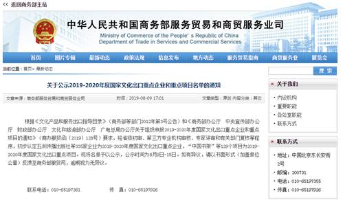 國家文化出口重點企業和重點項目,由商務部、中央宣傳部、財政部、文化和旅游部、國家廣電總局等部委聯合開展,經過省級初審、第三方專業機構審核、專家評審和有關部門復核、公示等程序聯合組織評選認定,旨在鼓勵和支持我國文化企業參與國際競爭,推動和弘揚中華文化。