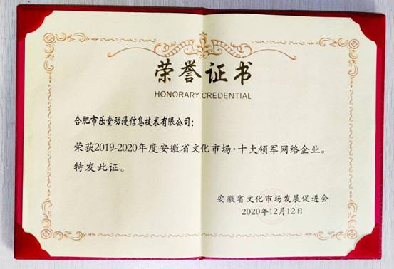 活動由安徽省文化和旅游廳等指導,安徽省文化市場促進會主辦。會上表彰了安徽省文化市場主體領軍者“五個十”,合肥樂堂動漫信息技術有限公司榮獲“網絡文化·十大領軍企業”獎項。